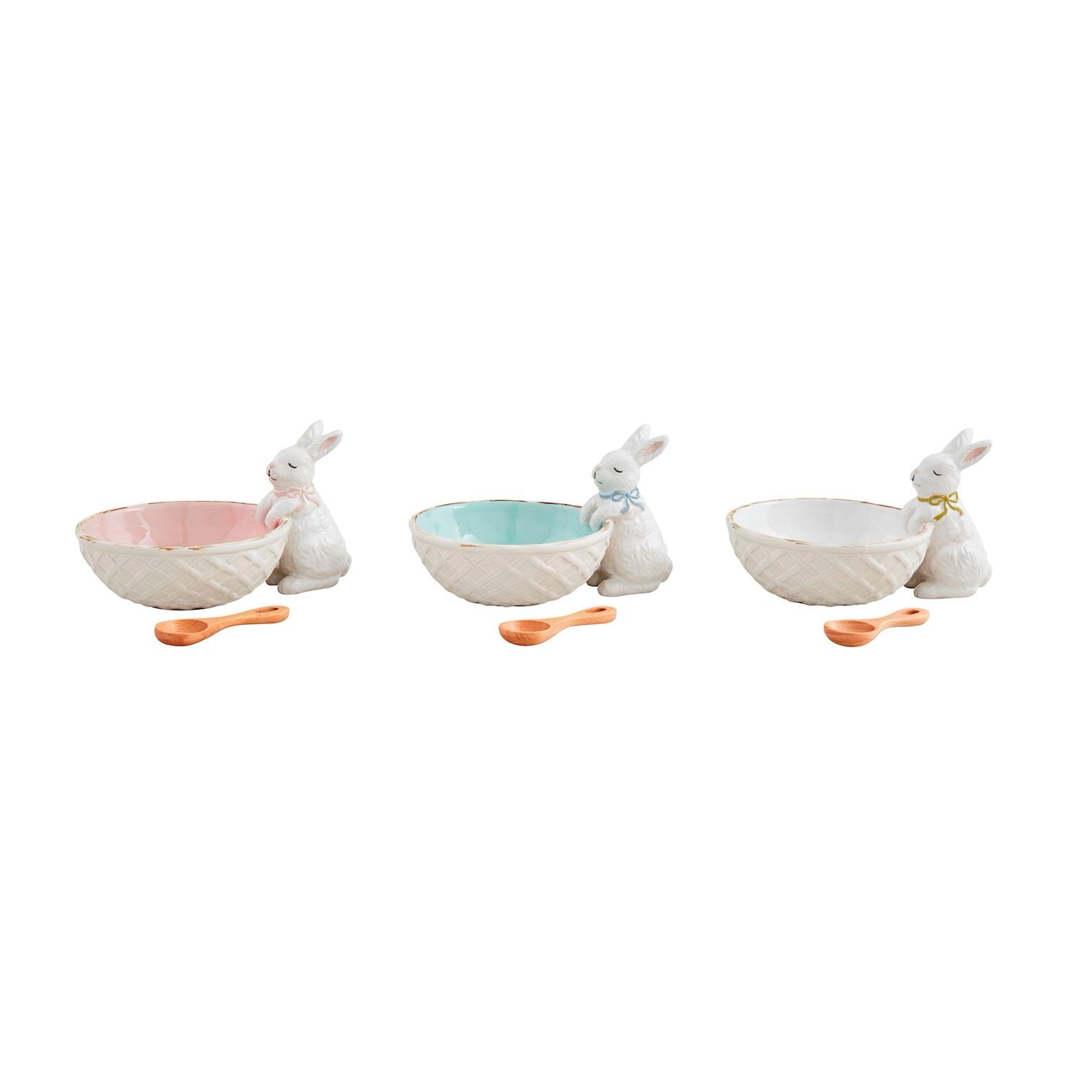 2-piece set. Hand-painted stoneware bunny candy bowl. Comes with wooden spoon.