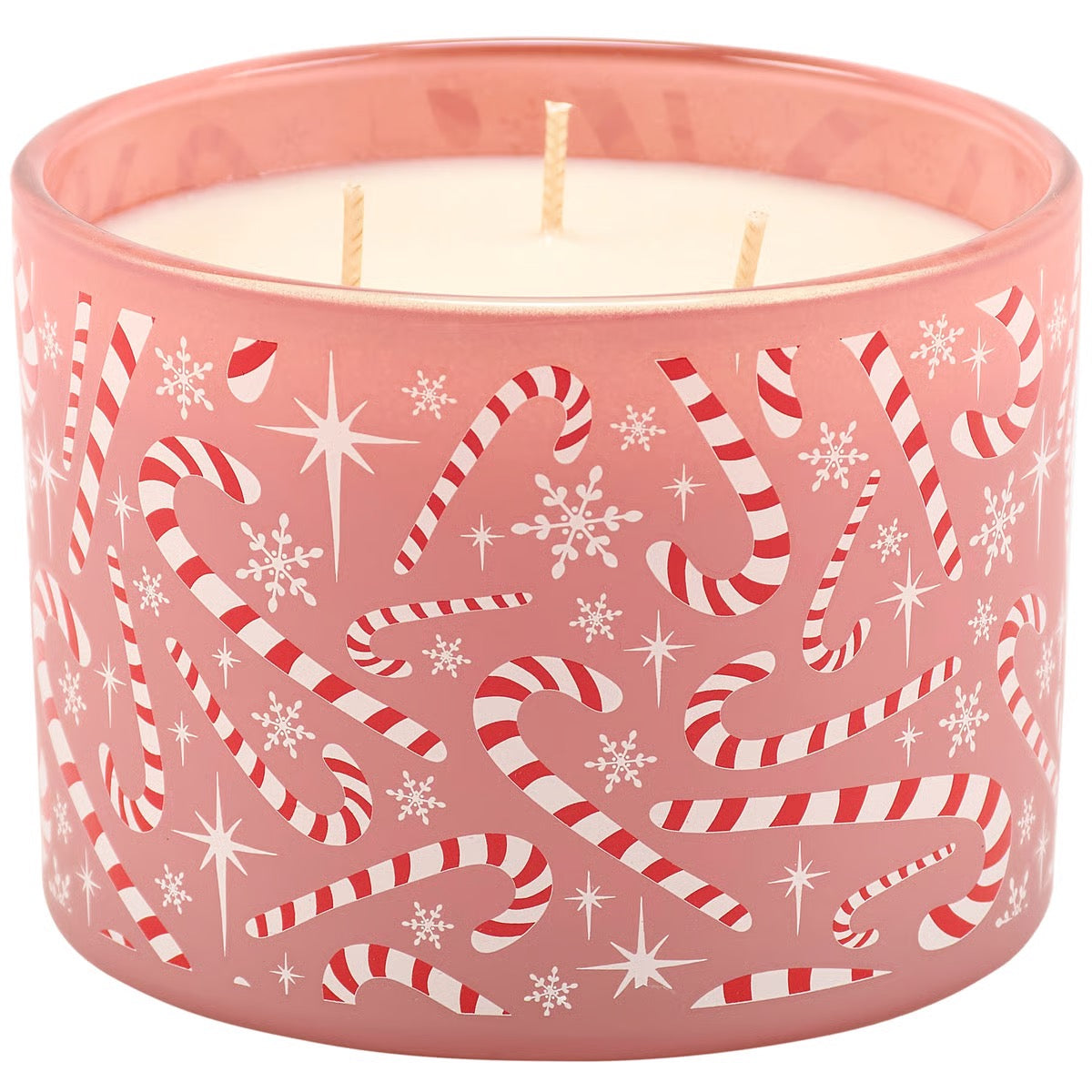 A candle displaying a pattern of hand illustrated snowflakes, north stars, and candy canes on frosted pastel pink glass. Seasonal candle features soy-based wax and 3 fabric wicks with 30 hours of burn time activating a refreshing Peppermint scent. Our Candy Canes candle includes a dust cover and plastic lid for protection and enhanced appearance on store displays. A retro inspired Christmas gift perfect for a seasonal home accent.