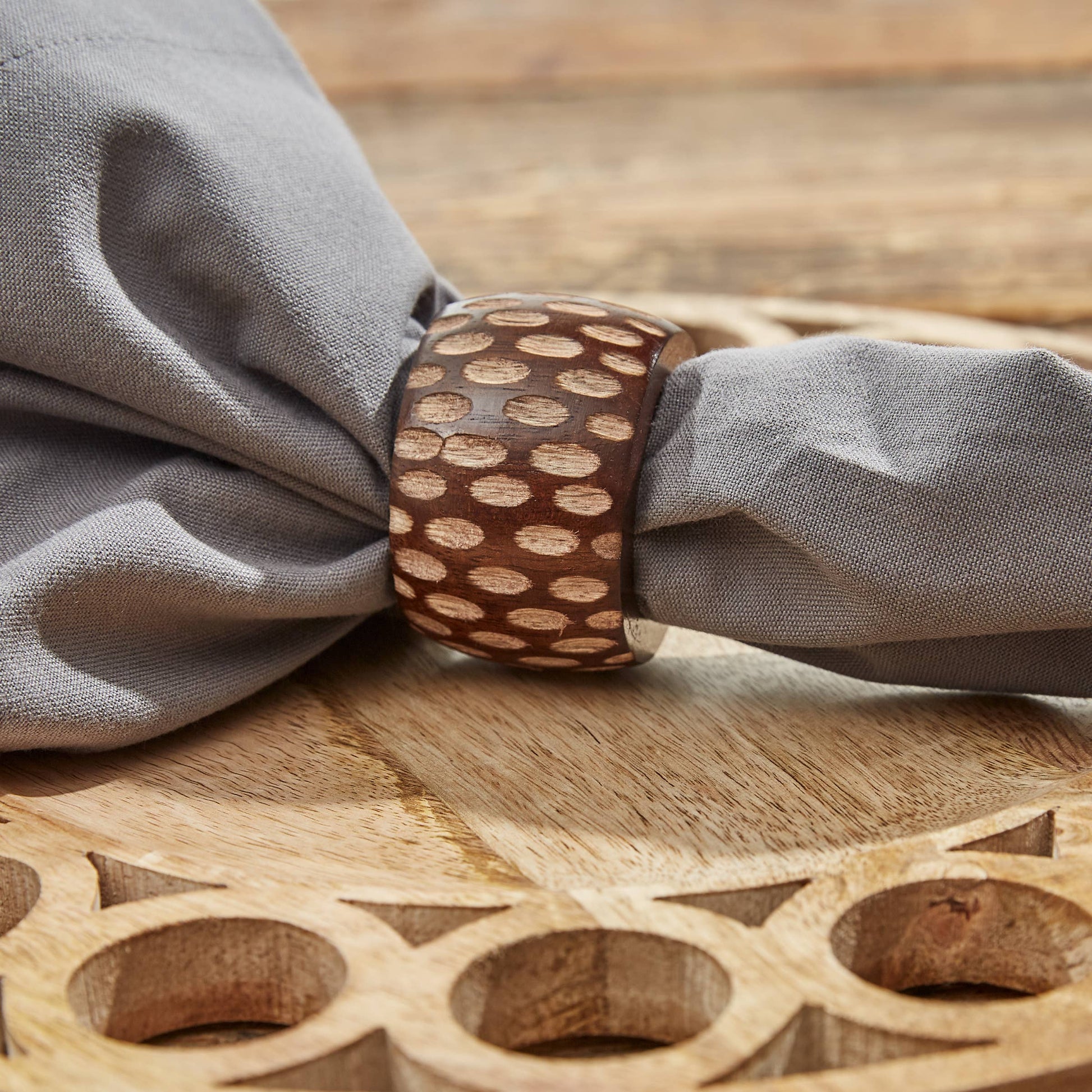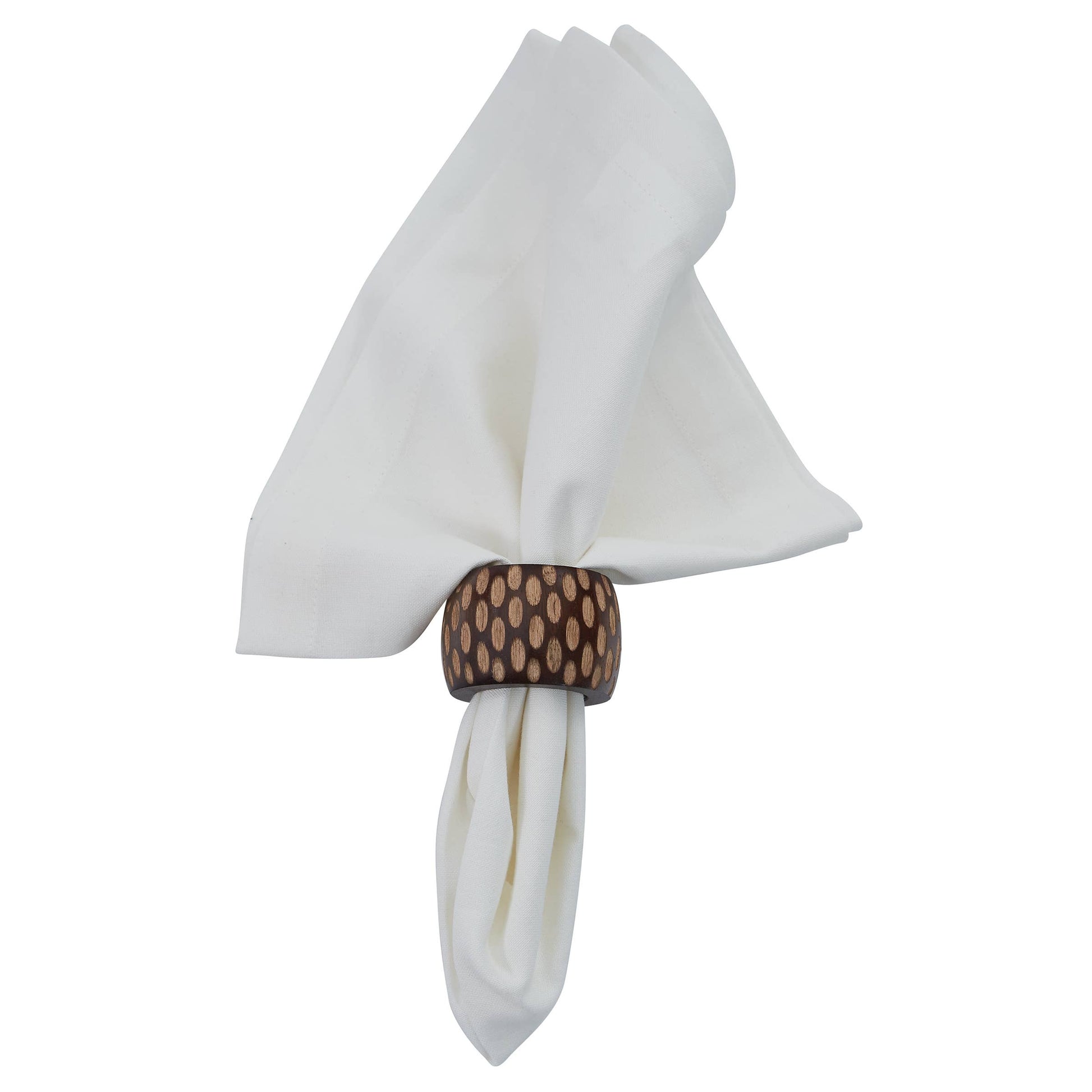 Beautifully crafted napkin rings! Designed to add an extra touch of personality and sophistication to your dining table. Complete the overall look of your dining setting using this skillfully crafted napkin ring set. Comprises of a chiseled oval pattern in a light tan tone against a dark brown background that is perfect for any home type. The wooden cuff will neatly compress the cloth napkin into a delicately presented manner that will add both visual appeal and organization to your table for daily, seasonal, or formal use.