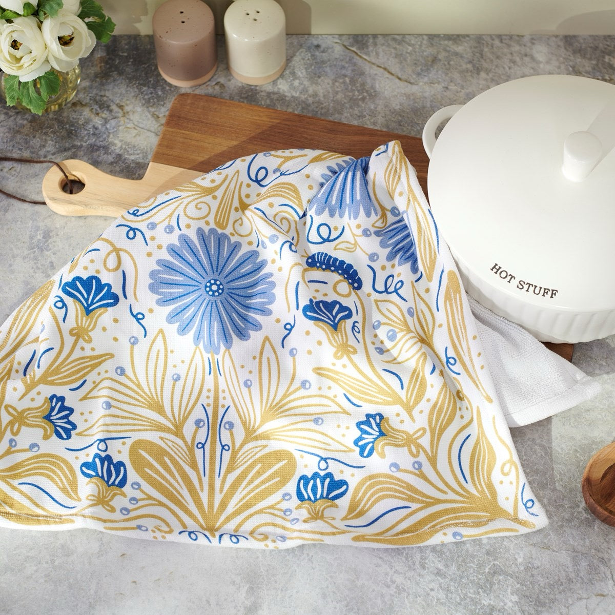 A cotton kitchen towel displaying an all-over design of purple florals replicated from original hand illustrated artwork inspired by folk art. Floral kitchen towel features a terrycloth layer on the back for added absorbency. Our Purple Floral kitchen towel is conveniently machine-washable for easy cleaning. Folk art towel is packaged on a cardboard hanger with hole to easily display on rack. A floral-themed kitchen accessory perfect for everyday use.