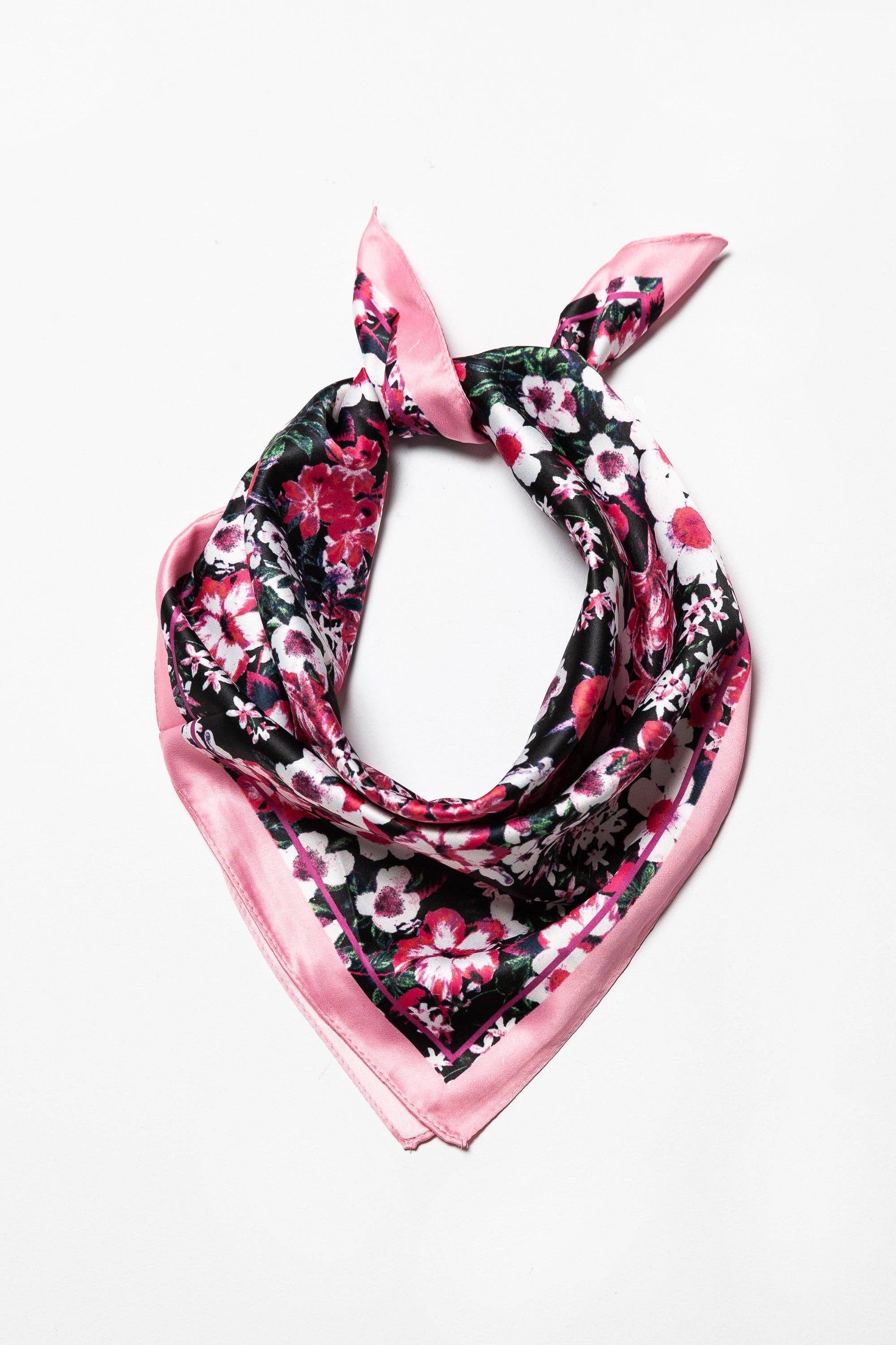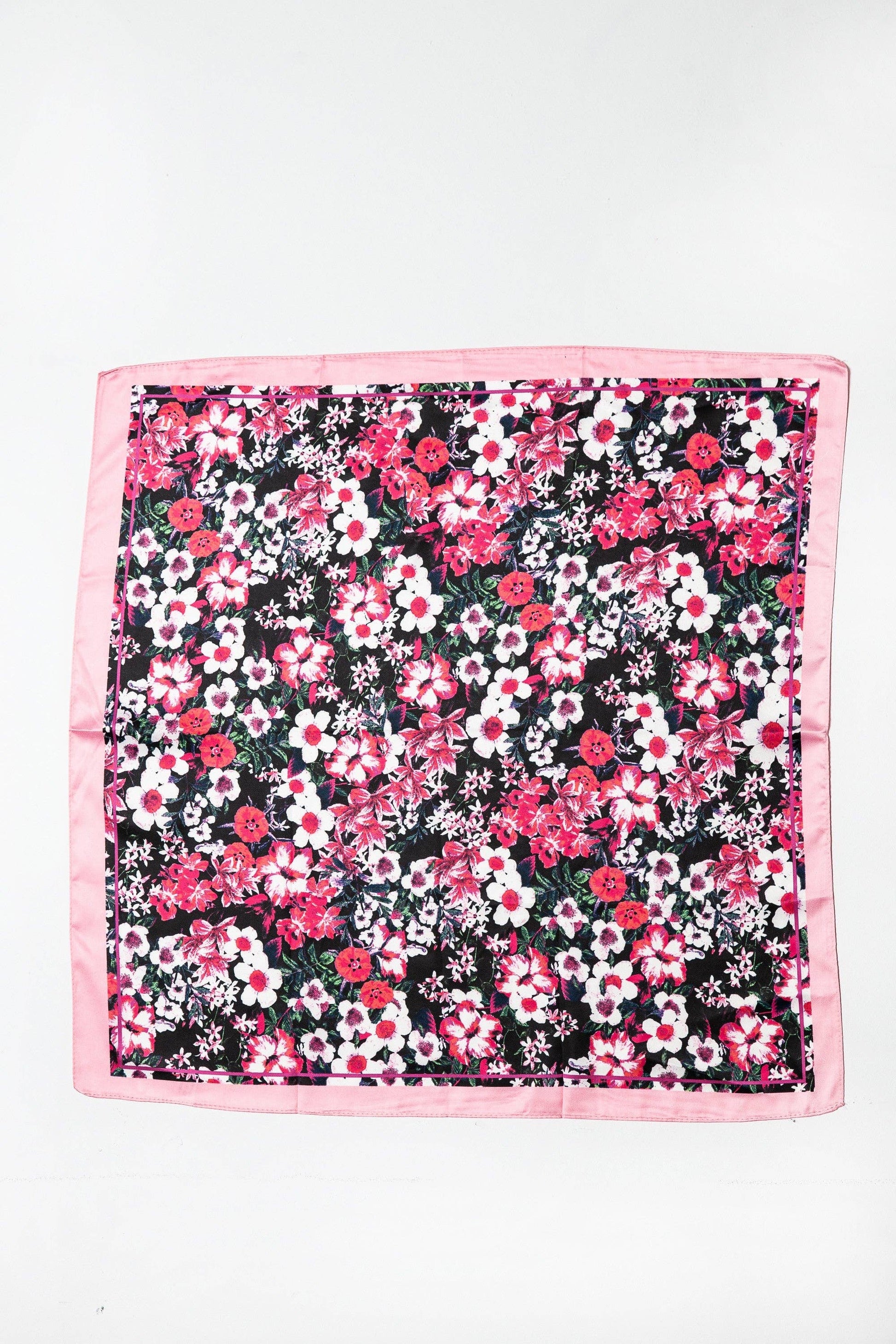 Pink Flower Print Silky Feel Bandana Scarf