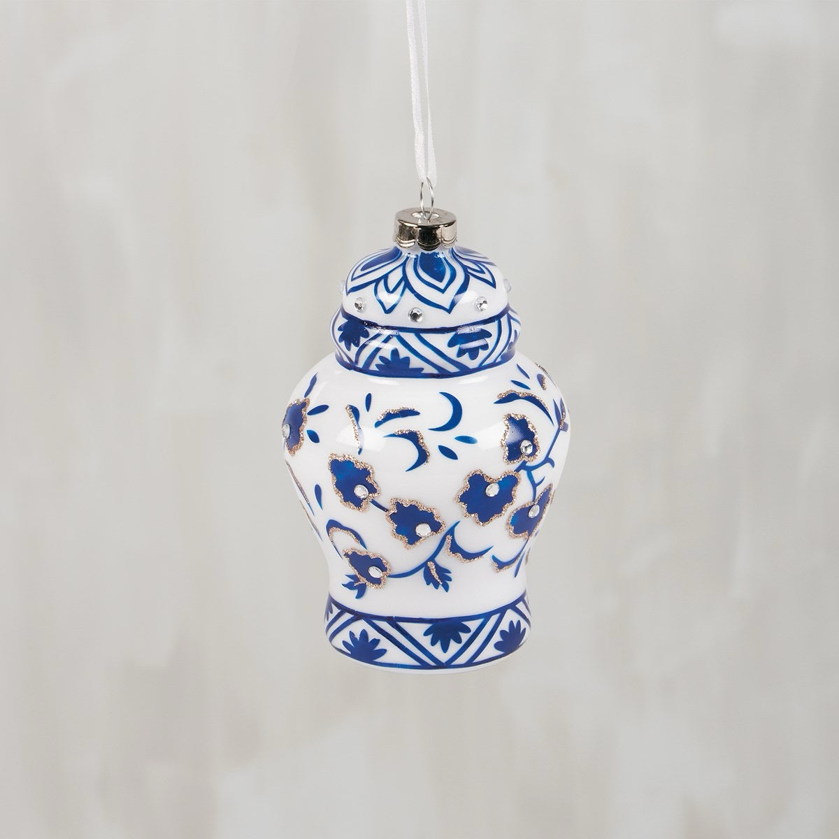 A glass ornament displaying a chinoiserie inspired design on an urn with glitter and craft jewel accents. Our glass Indigo Urn ornament is ready to hang for display via the included top loop. A vintage style gift perfect for adding personality to a Christmas tree or for everyday indigo-themed displays.