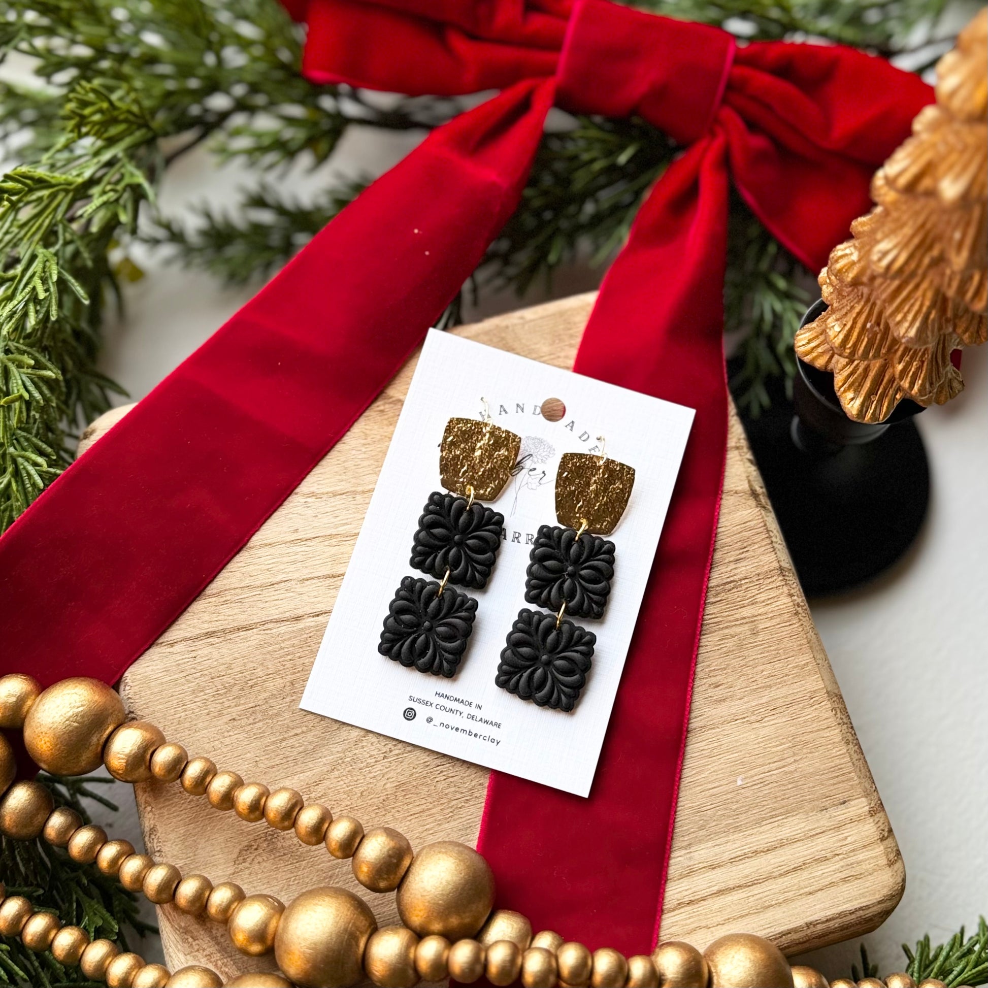 Gold Trapezoid Charm w/2 Black Scalloped Squares Dangle