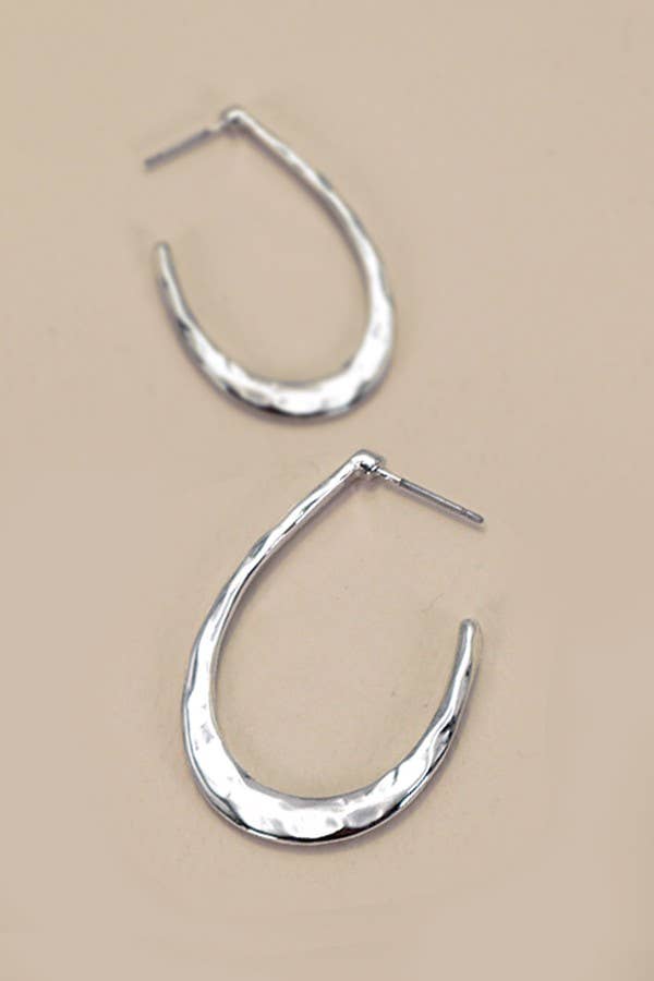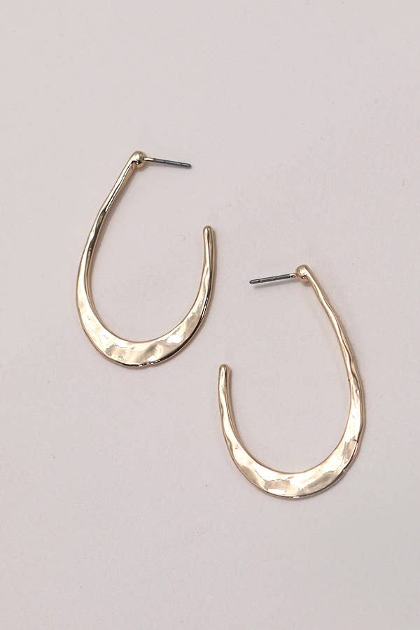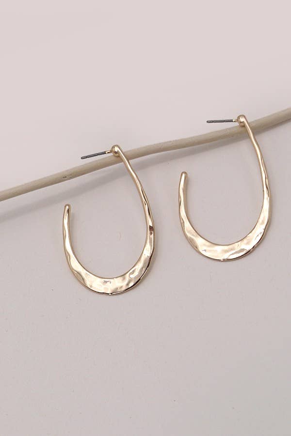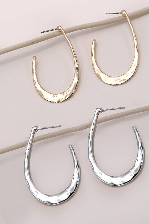 Hammered U Shape Hoop Drop Earrings, these earrings feature sleek U-shaped hoops delicately hammered to create a textured surface that catches the light beautifully. These earrings showcase a unique U-shaped hoop design with an artfully hammered texture, adding a touch of contemporary elegance to your ensemble. The dropped silhouette creates a graceful movement, enhancing the overall allure of these statement earrings. Product Details: Width: 1" Length: 1.75" Earring back: Post