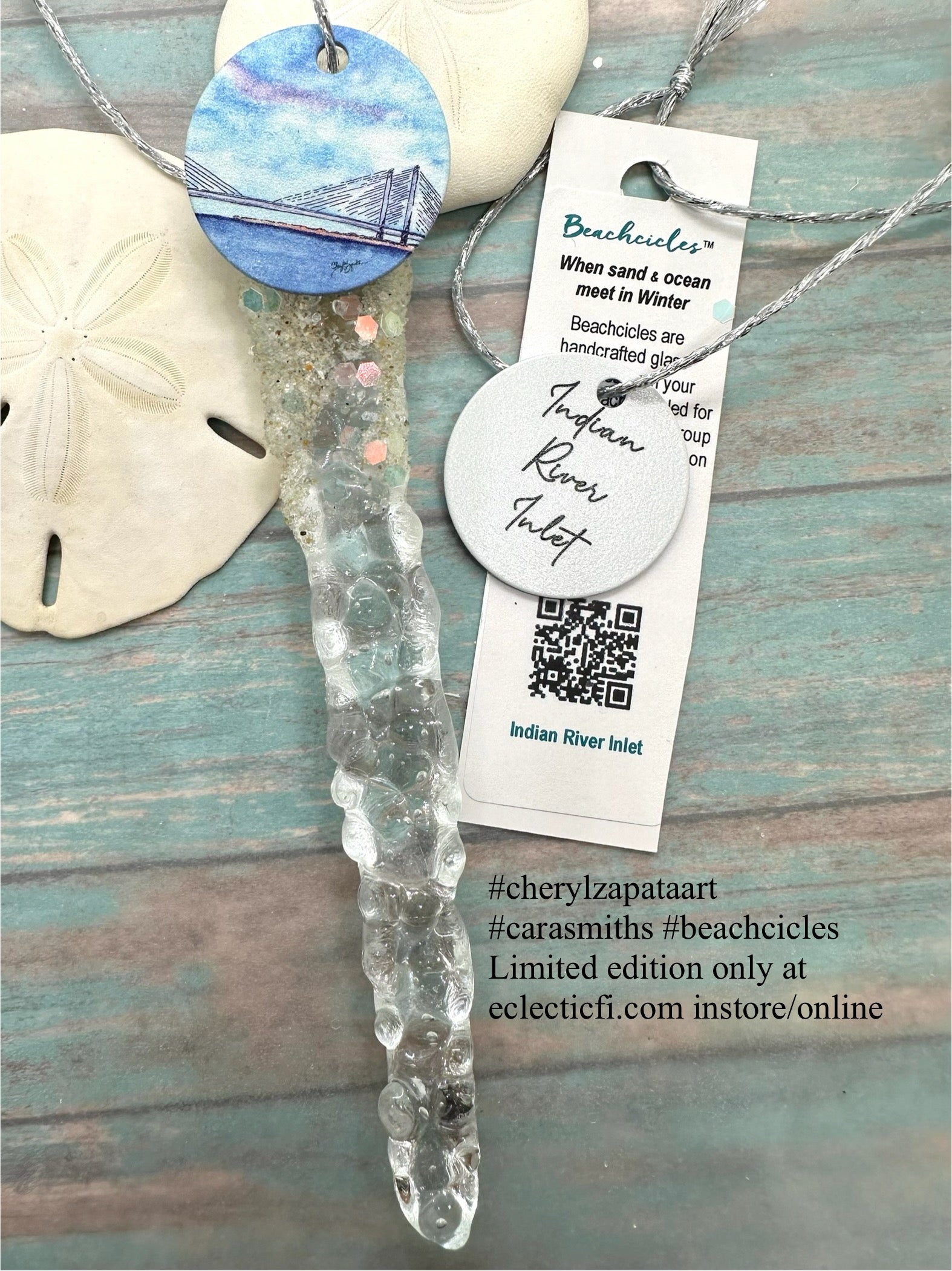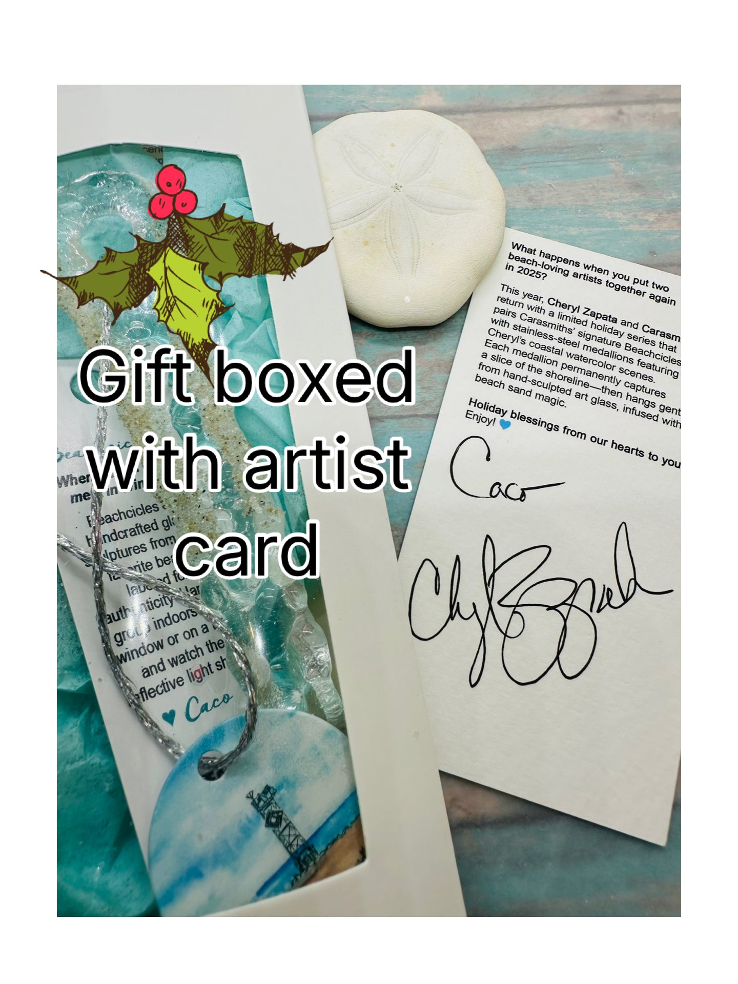 Cheryl Zapata’s watercolors and Carasmiths’ glass limited holiday series pairing Carasmiths’ signature Beachcicles with stainless-steel medallions featuring Cheryl’s coastal scenes.