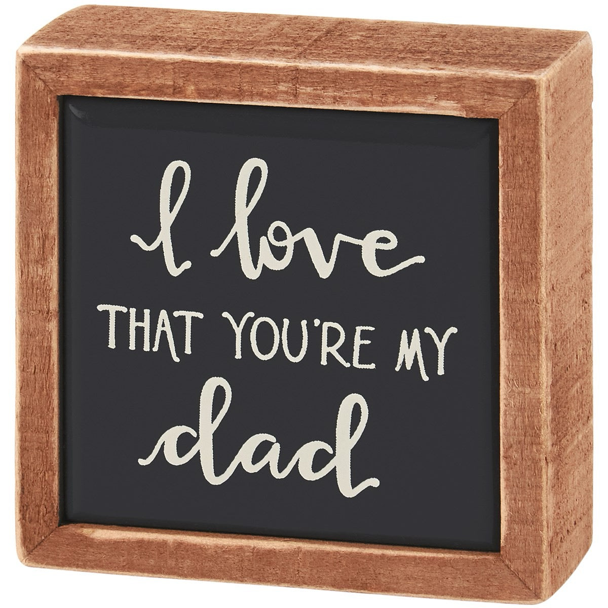 "I Love That You're My Dad." Dad box sign mini features a natural wood frame and faux enamel finish behind design for a tile-like appearance. Our I Love That You're My Dad mini box sign is easy to hang or can free-stand alone. A lovely Father's Day gift that can easily blend into any display.