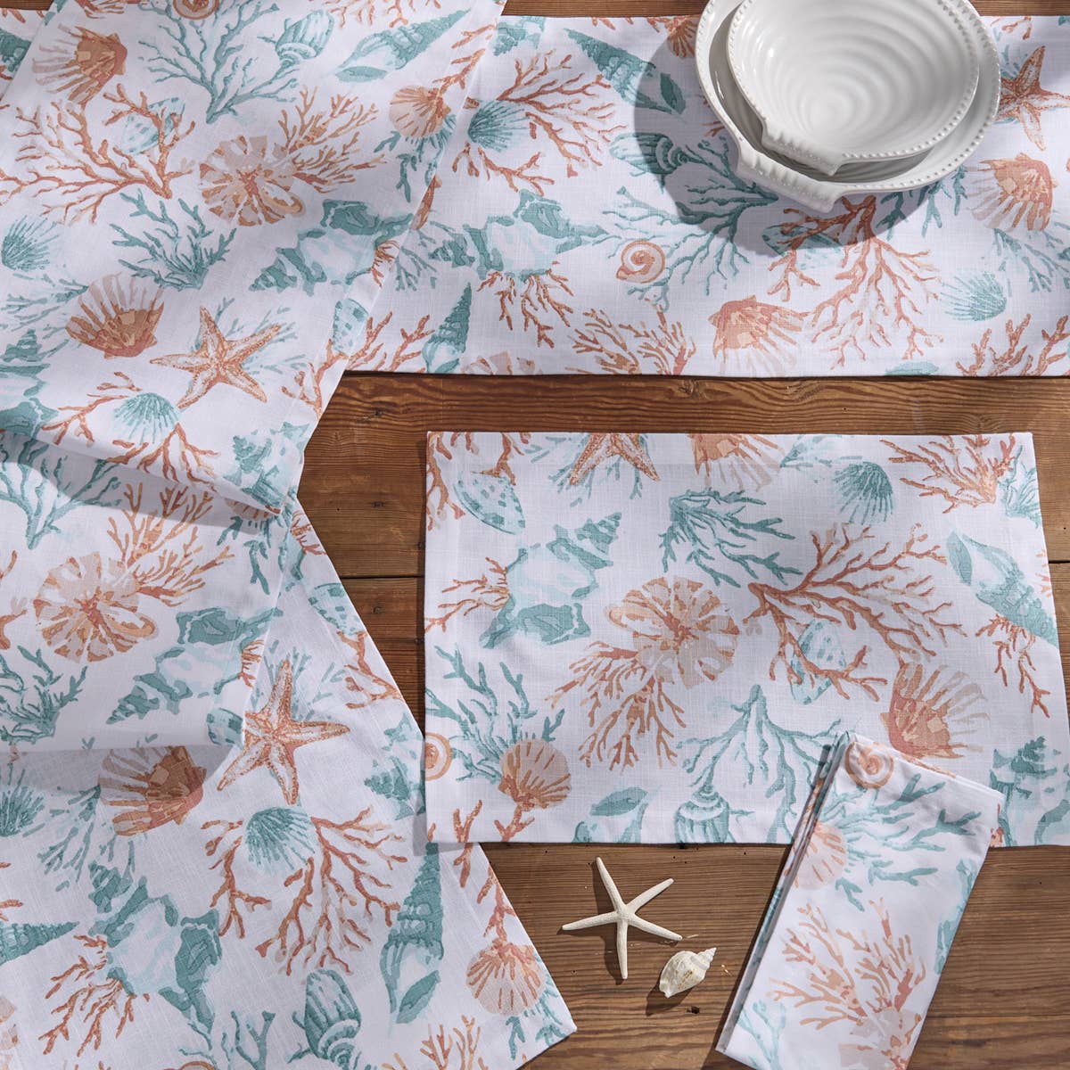 Bring the serene beauty of the coast to your table with the Low Tide Table Runner. Featuring a delightful print of coral, seashells, and starfish in soothing shades of aqua and coral, this placemat is crafted on white slub fabric, adding a touch of texture and charm. Measuring 14" x 54", it's the perfect addition to any coastal-themed décor, making every meal feel like a beachside escape.