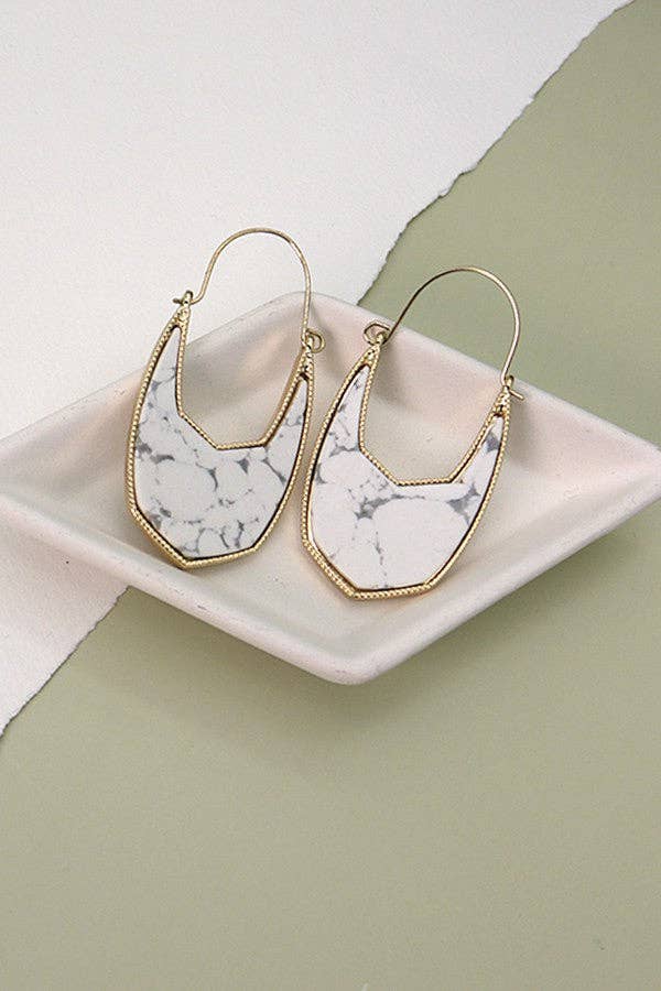 We are falling for these earrings because they are amazing! This earring has a geo shape on a natural stone hoop earrings. DIMENSION length: 2" width: 1" earring