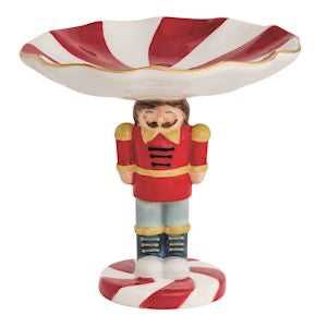 Description: Ceramic candy dish features hand-painted figural ceramic pedestal base.