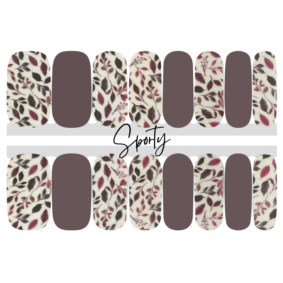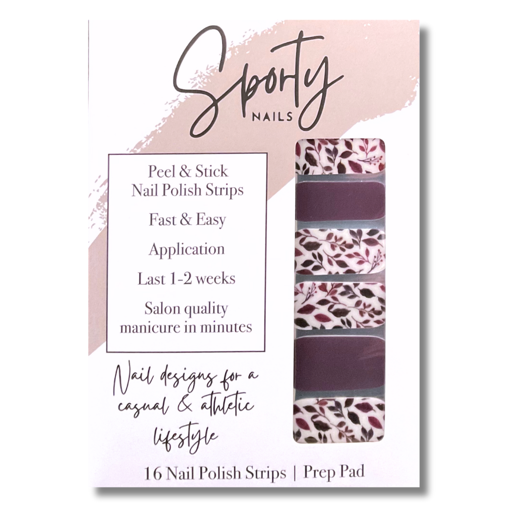 Deep plum nail stickers are flanked with nail strips featuring a matching leafy botanical design on a white background. This mixed manicure design's deep color is perfect for your fall wardrobe and will make a statement!