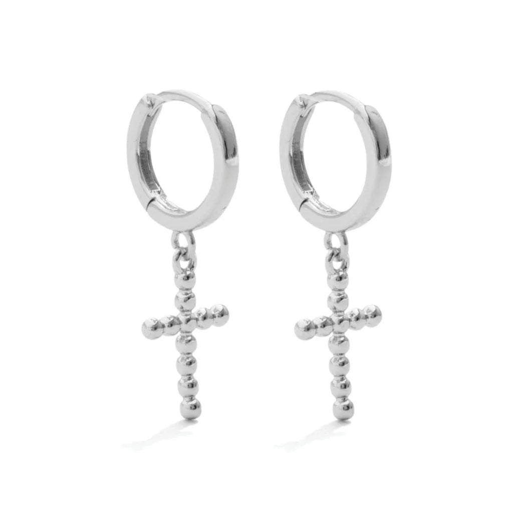 Silver Cross Drop Huggie Earrings