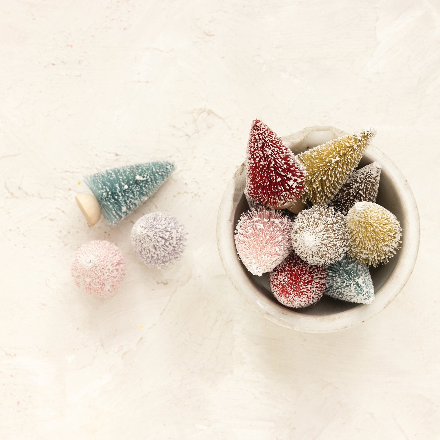 4"H Sisal Bottle Brush Trees w/ Wood Bases, Snow Finish, Multi Color, Set of 12