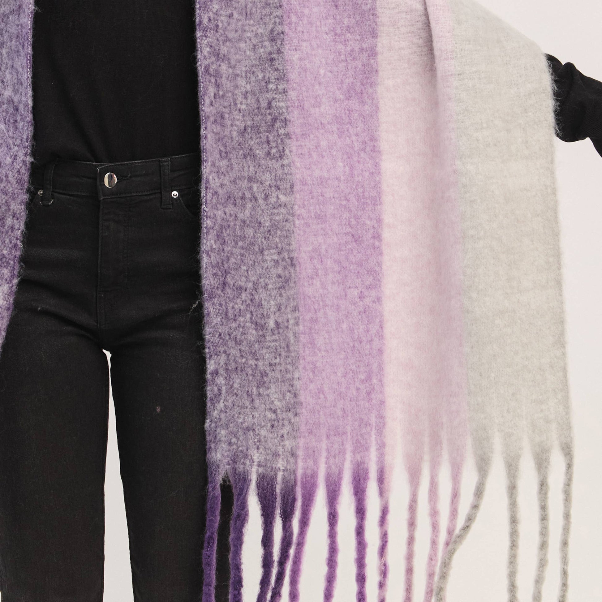 Purple Solid Brushed Color Stripe Block Fringe Scarf