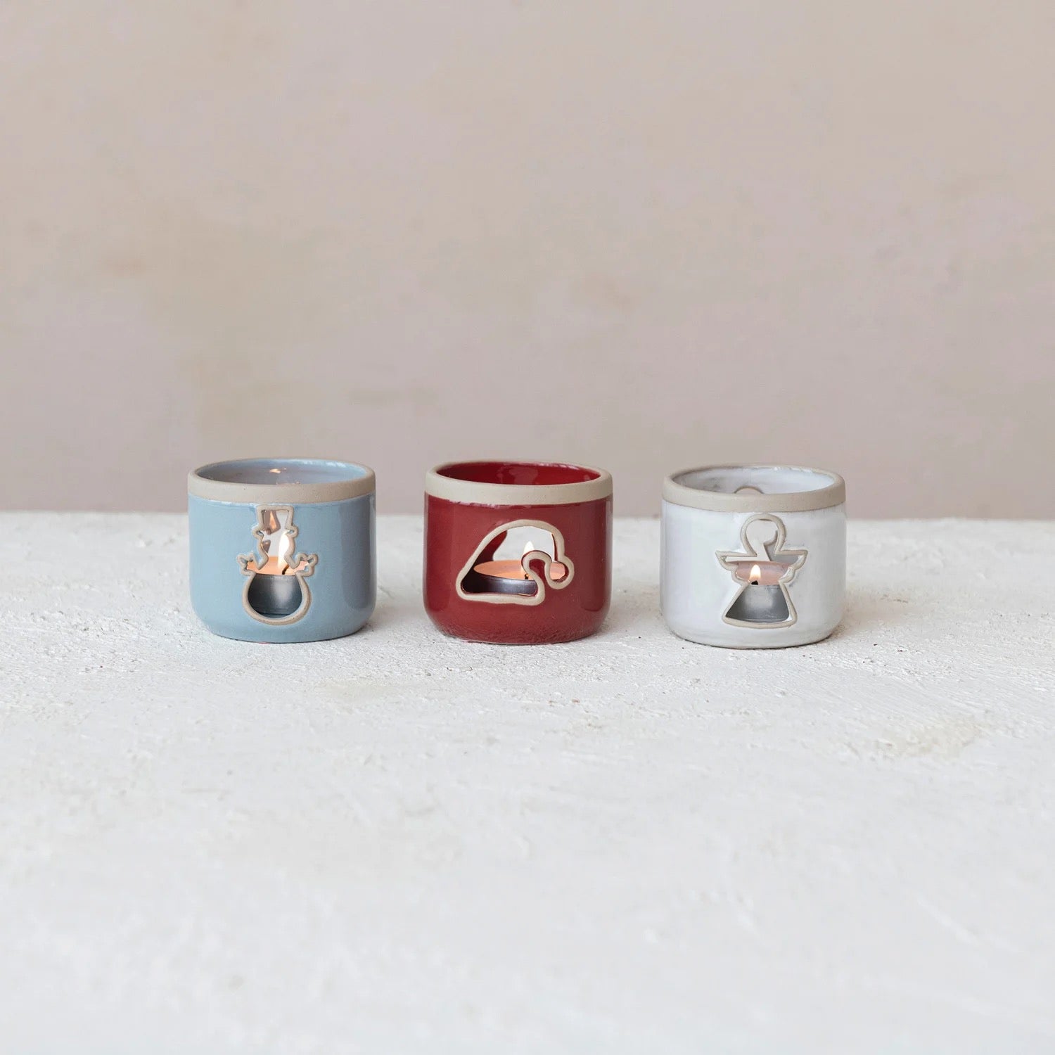 3" Round x 2-3/4"H Stoneware Tealight Holder w/ Holiday Icon Cut-Out, Reactive Glaze, 3 Colors, 3 Styles