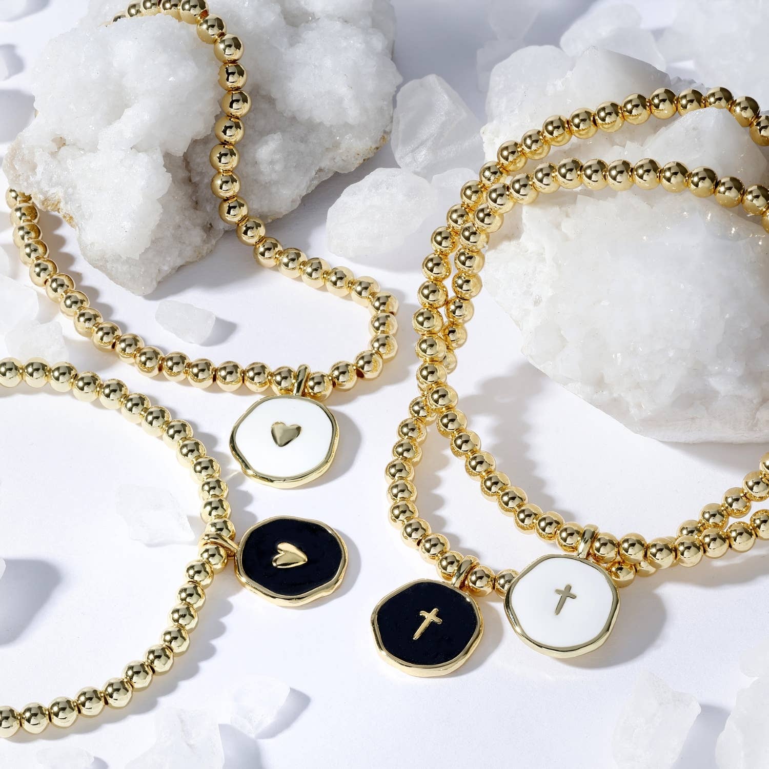Beaded stretch bracelet with an enamel-filled charm and a delicate gold cross, perfect for those seeking spiritual inspiration. Faithful and up-lifting. Stretch Bracelet .5" Charm 4mm beads 18k Gold Plated Brass Base Enamel